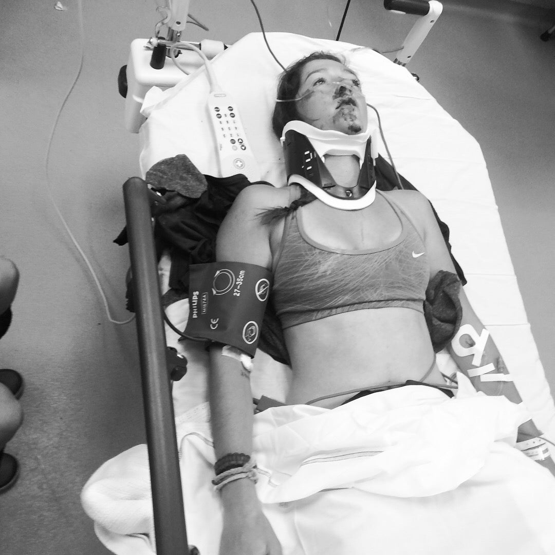 I hit the ground so hard I thought I’d popped a lung. I felt shards of my teeth in my mouth. Adrenaline kicked in, and I sat up, pulled my phone out of my pocket, and instinctively dialed 911. Thank goodness I had service. By the time the operator was on the line, my friends had gotten to me and took over the call. I sat there in blistering pain for forty-five minutes, rigid, bleeding everywhere, waiting for the medics to arrive . . . knowing I had broken my back.