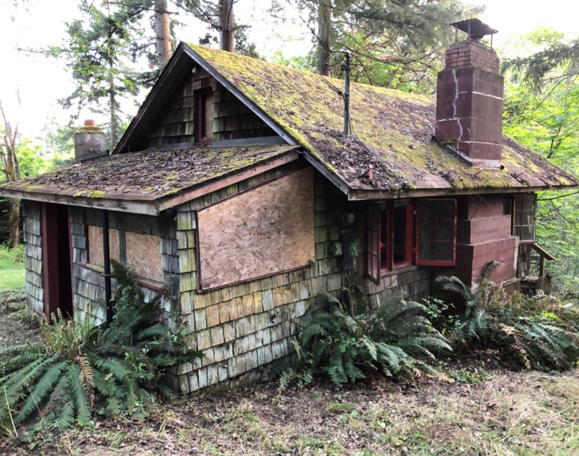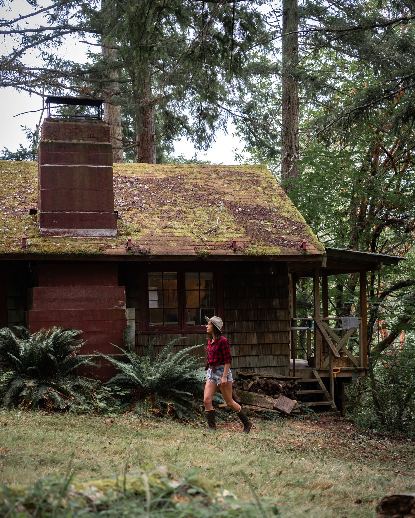 That’s when my mom’s friend of a friend brought us to her abandoned moss-covered cabin just around the corner from my parents’ house. I had walked by the place many times in my life and thought to myself that it was sad to let an adorable cabin fall into the ground. The forest was consuming it. Mice inhabited every inch. Blackberries not only covered the yard but were crawling up the walls. Tarps and boards covered broken windows.