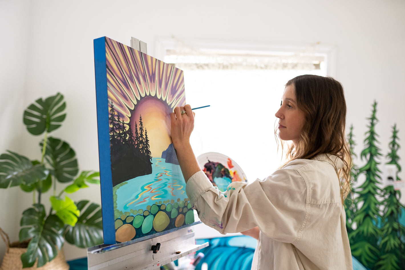 Slowly but surely the cabin’s magic began to shine. Sitting above a ravine, we befriended the owls, deer, and forest creatures that inhabited that slice of heaven. It became our creative oasis. I spent most days painting on the back deck above the ravine, listening to the forest sounds. Kory set up a desk inside and began building his own book publishing business. Just a five-minute walk up and down a hill from the Puget Sound, we went swimming and paddle boarding in the summer.