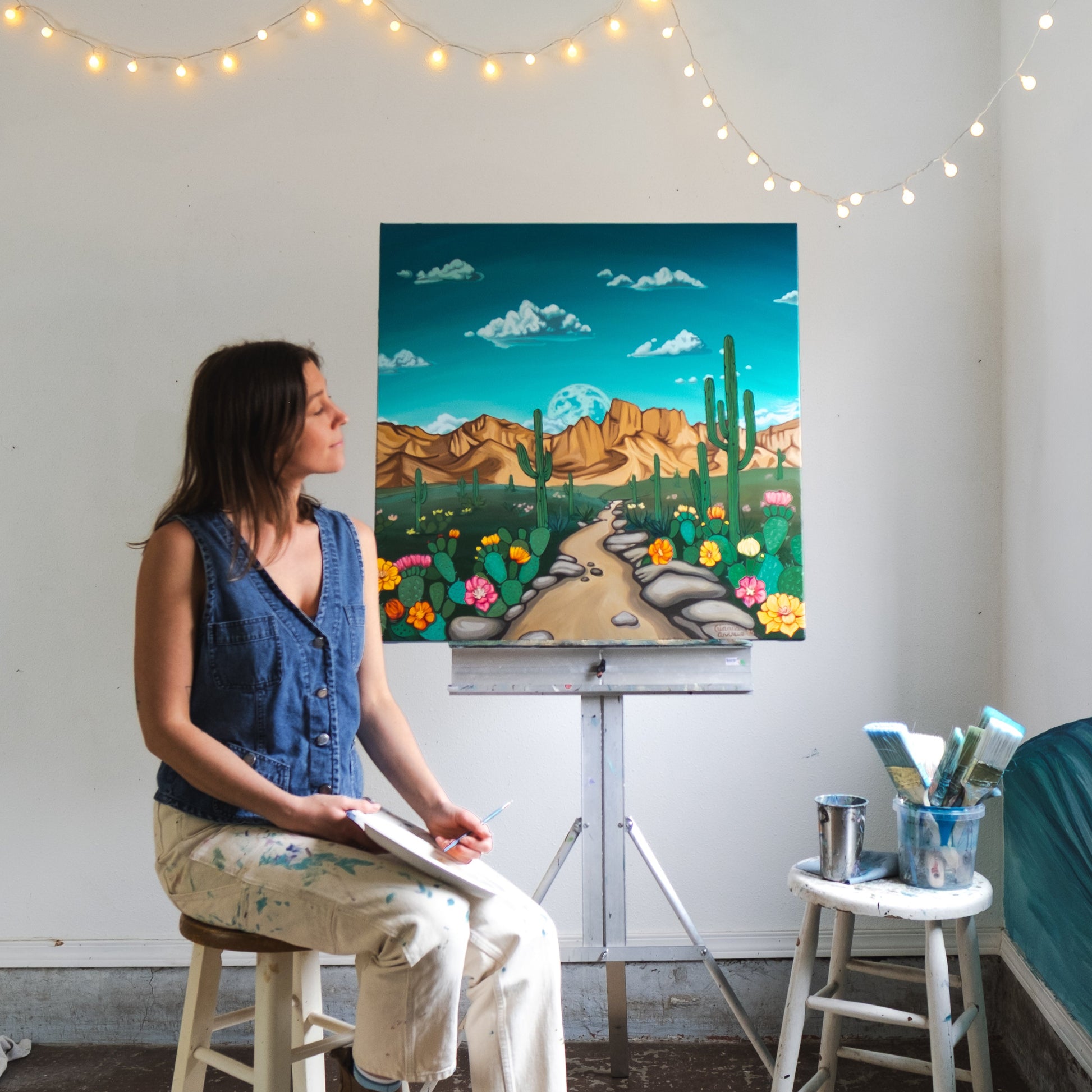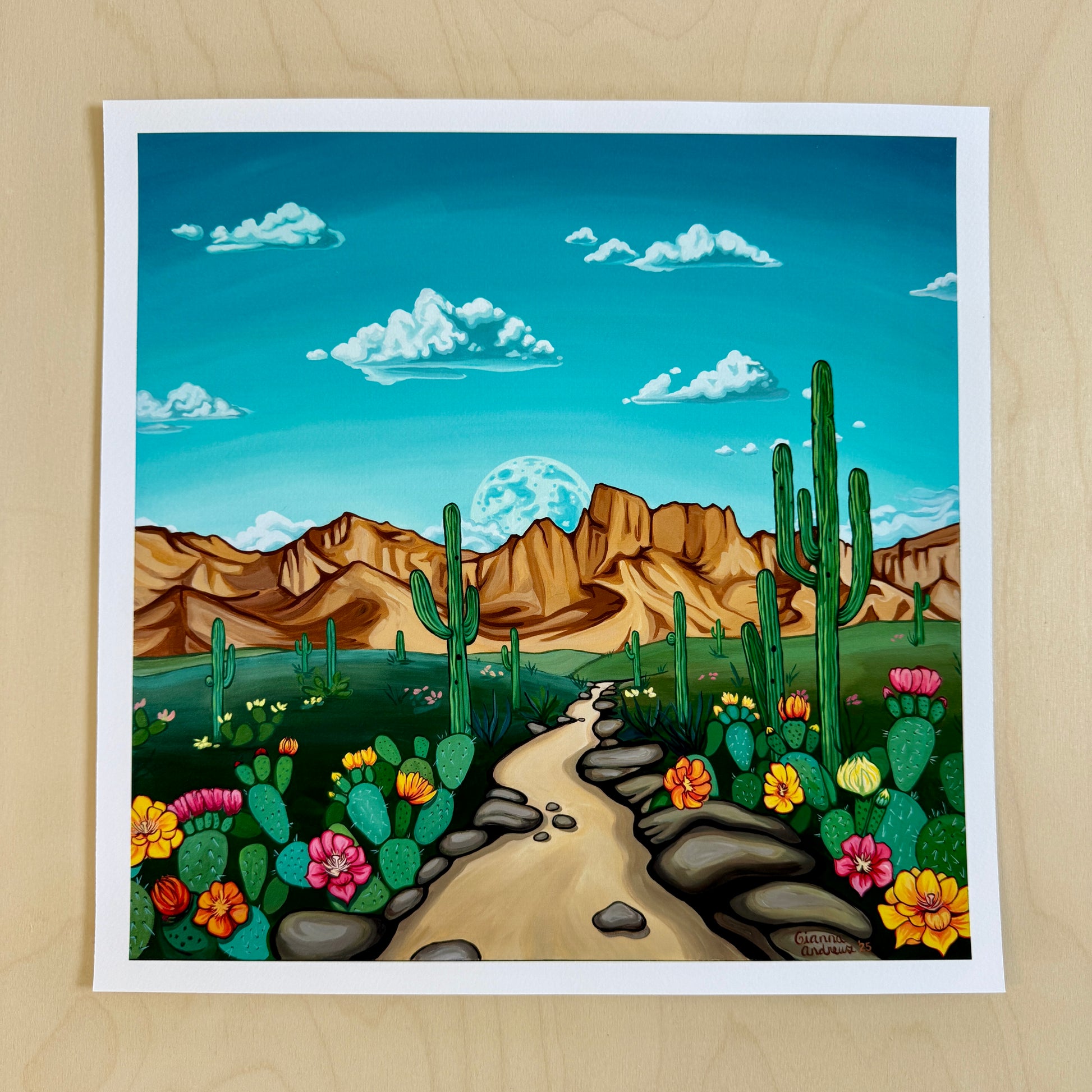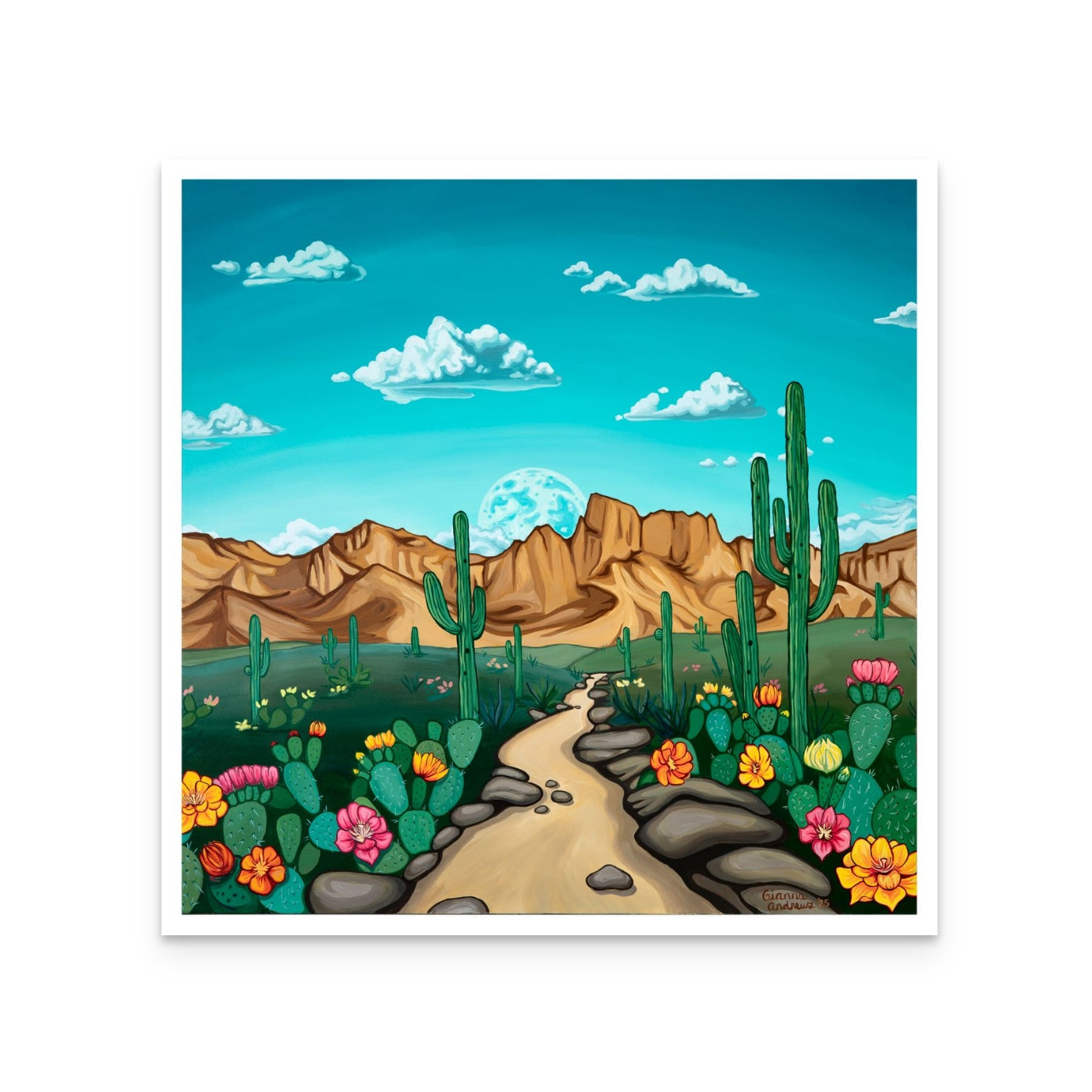Inspired by Tucson, Arizona and the Santa Catalina’s in the springtime, this piece is sure to brighten any space. Desert clouds and a high noon sun offer a fresh breeze reminiscent of day dreams. Don’t forget to stop and smell the flowers, just be careful you don’t get poked by a prickly pear cactus!