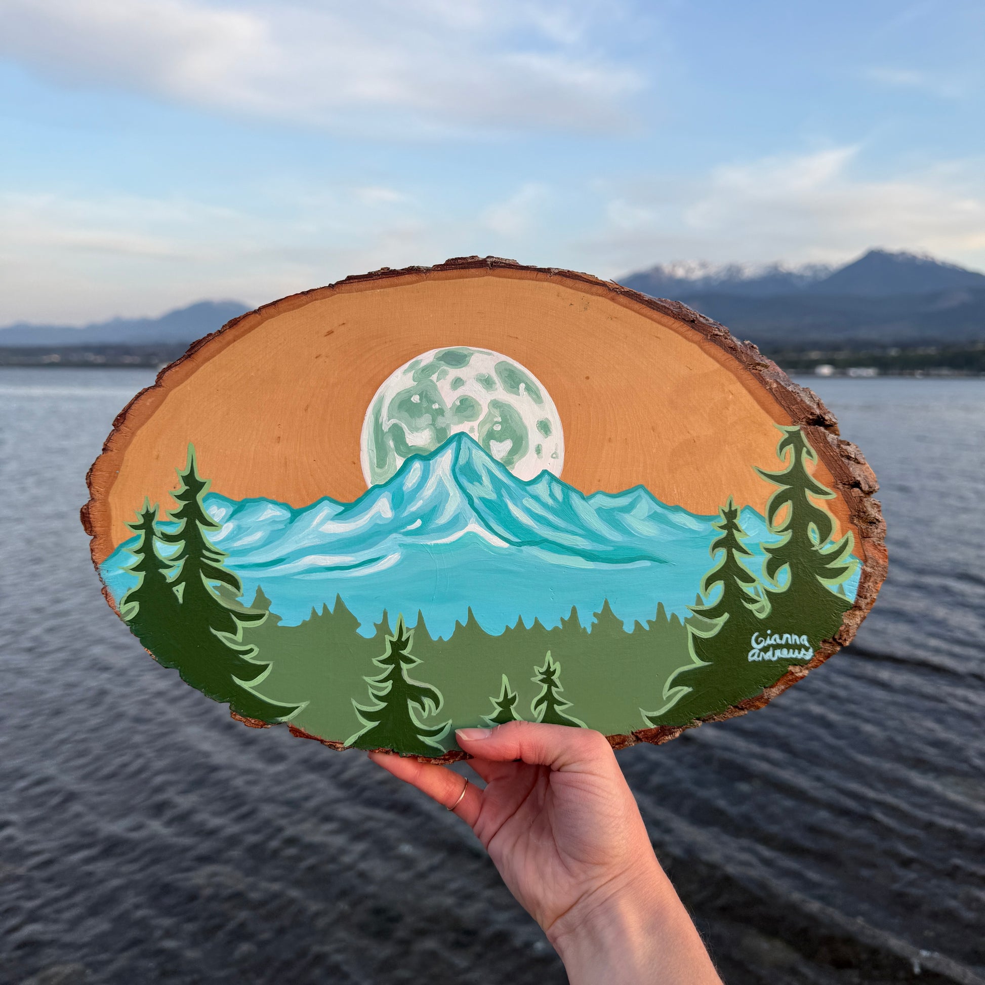 Original acrylic painting on wood round. Signed by the Artist. Arrives ready to hang.