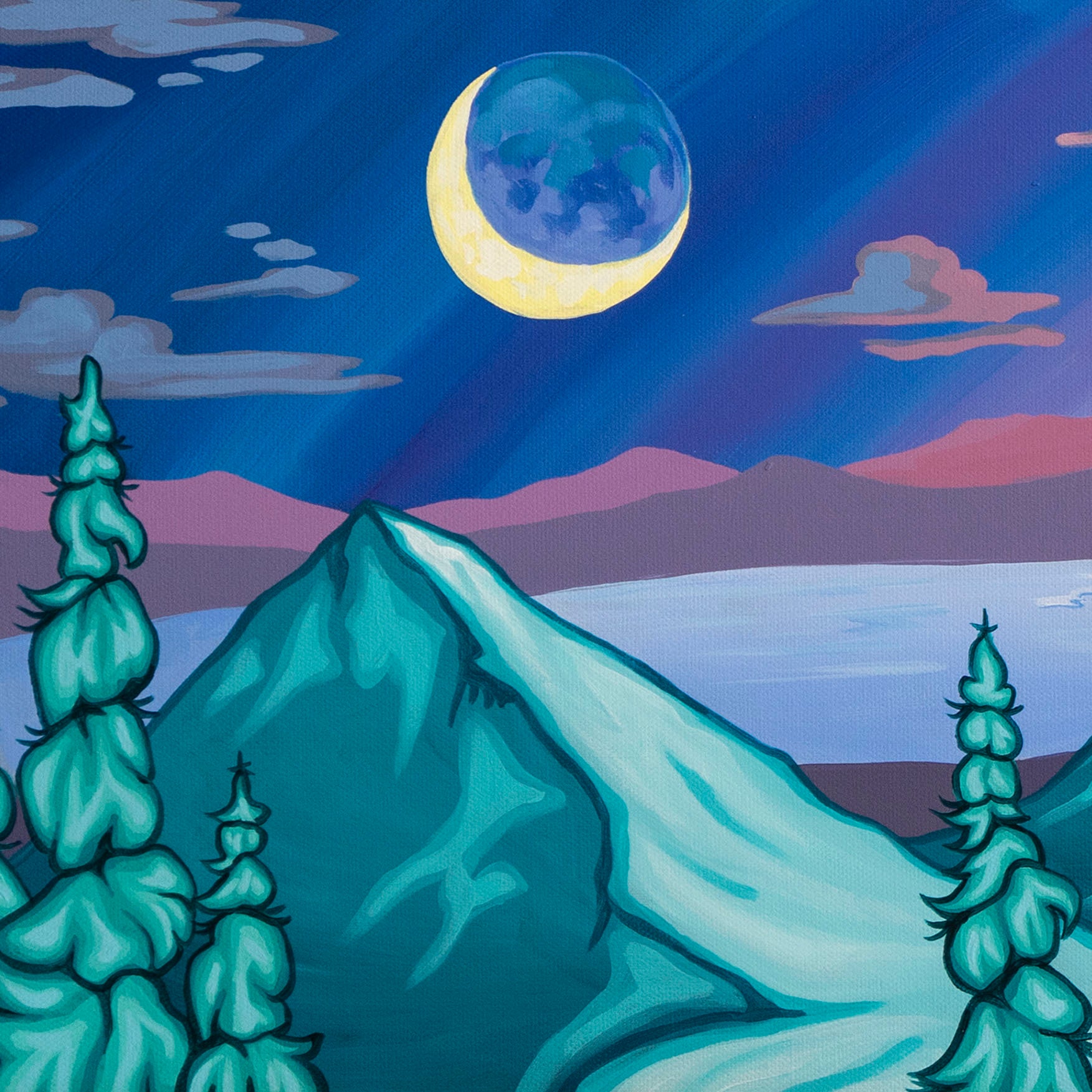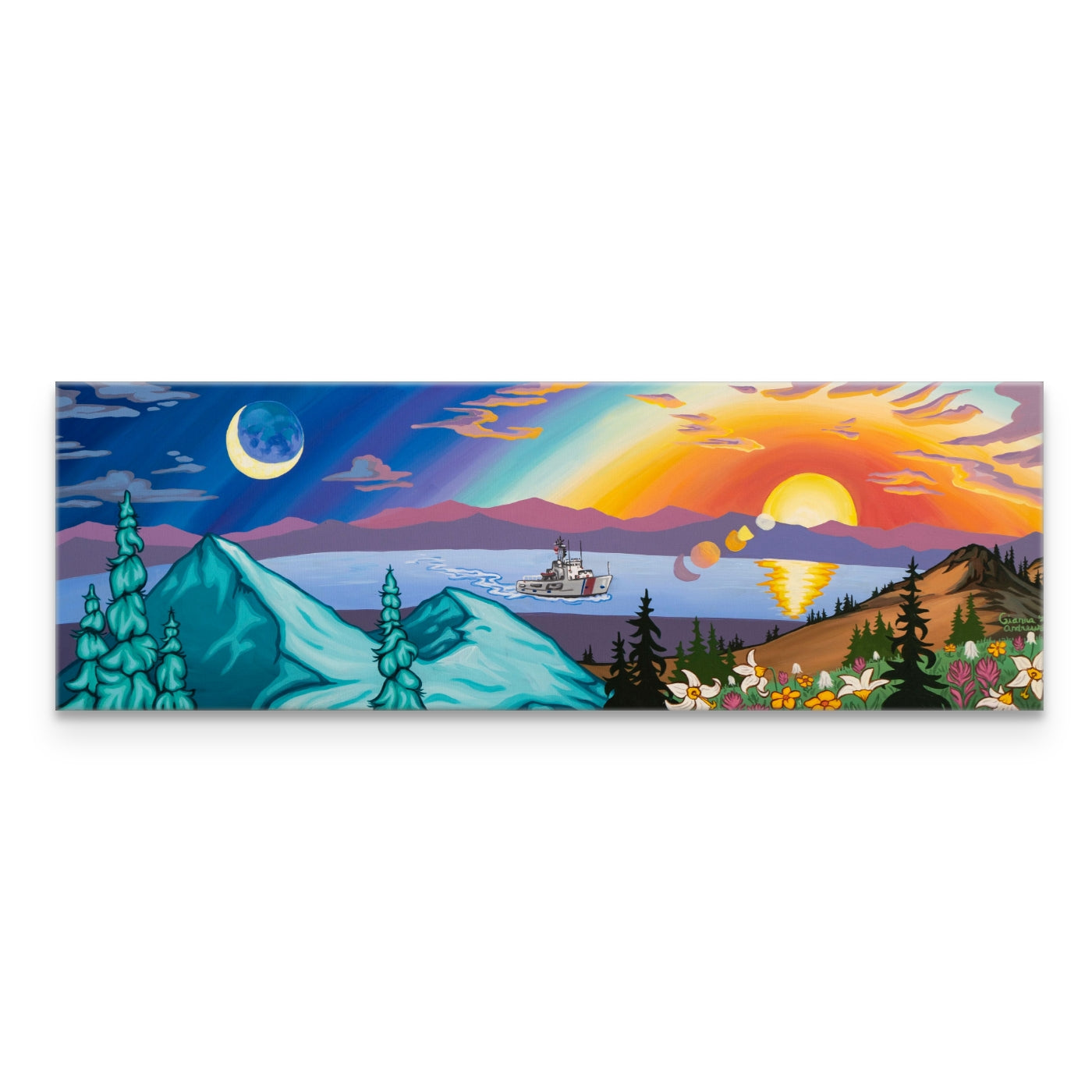 The view of the Olympic Mountains looking towards the Strait of Juan De Fuca has never been as stunning. Transitioning from nighttime winter snow ghosts to daytime summer blooms, this piece really has it all. The Coast Guard Cutter ship is also featured. The original painting was commissioned to commemorate the time of a US Coast Guard who was stationed in Port Angeles.