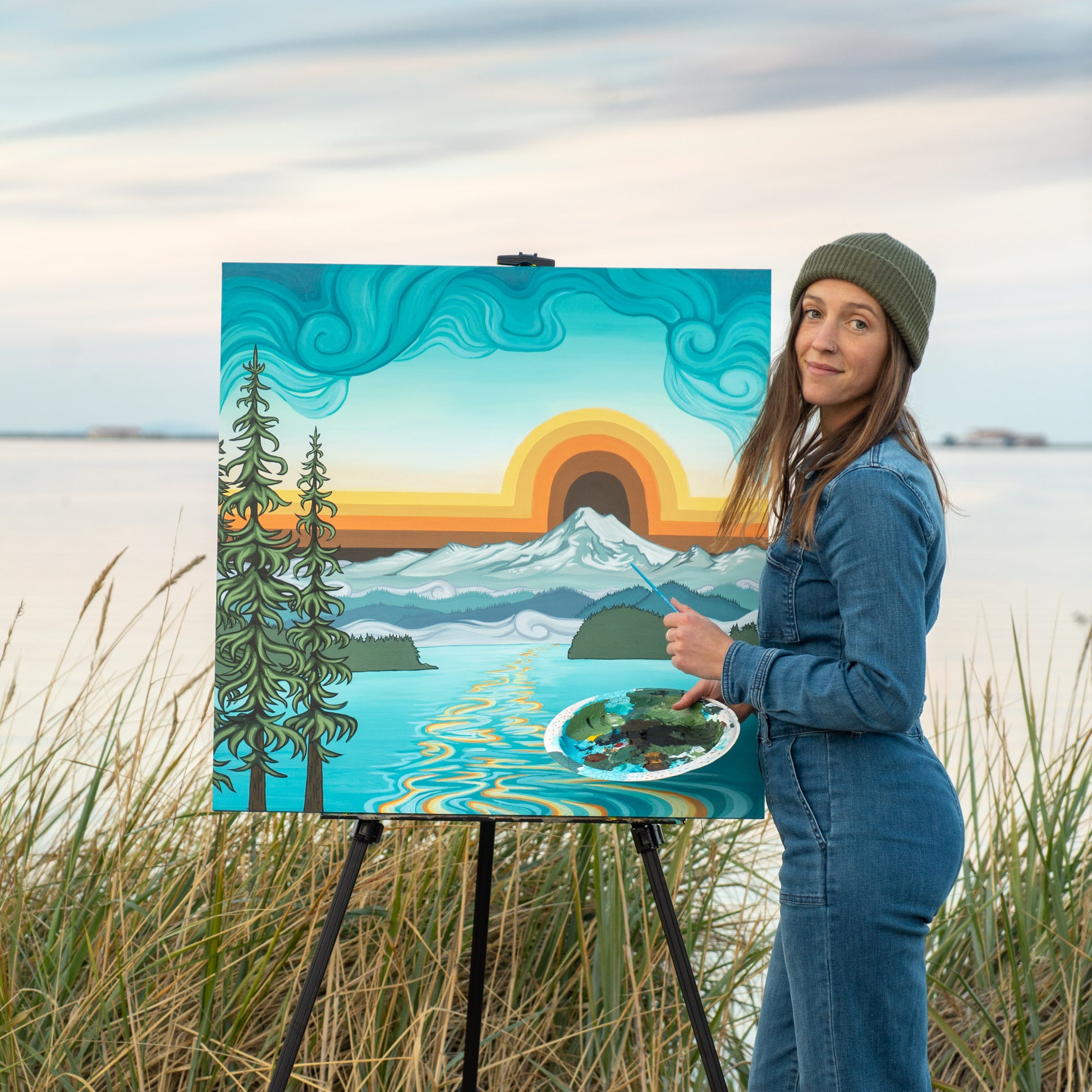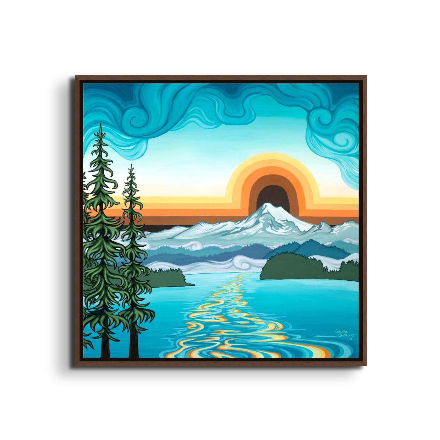 Picture yourself on a boat near an island, with evergreen trees, views of majestic Mount Baker, and swirling skies. Reflections of a mystical-mod style sunset dance in the waters surrounding you. "Magic in the Air" is inspired by a harmony of elements in the upper left USA. Fill your space with the uplifting aura of this magical place.