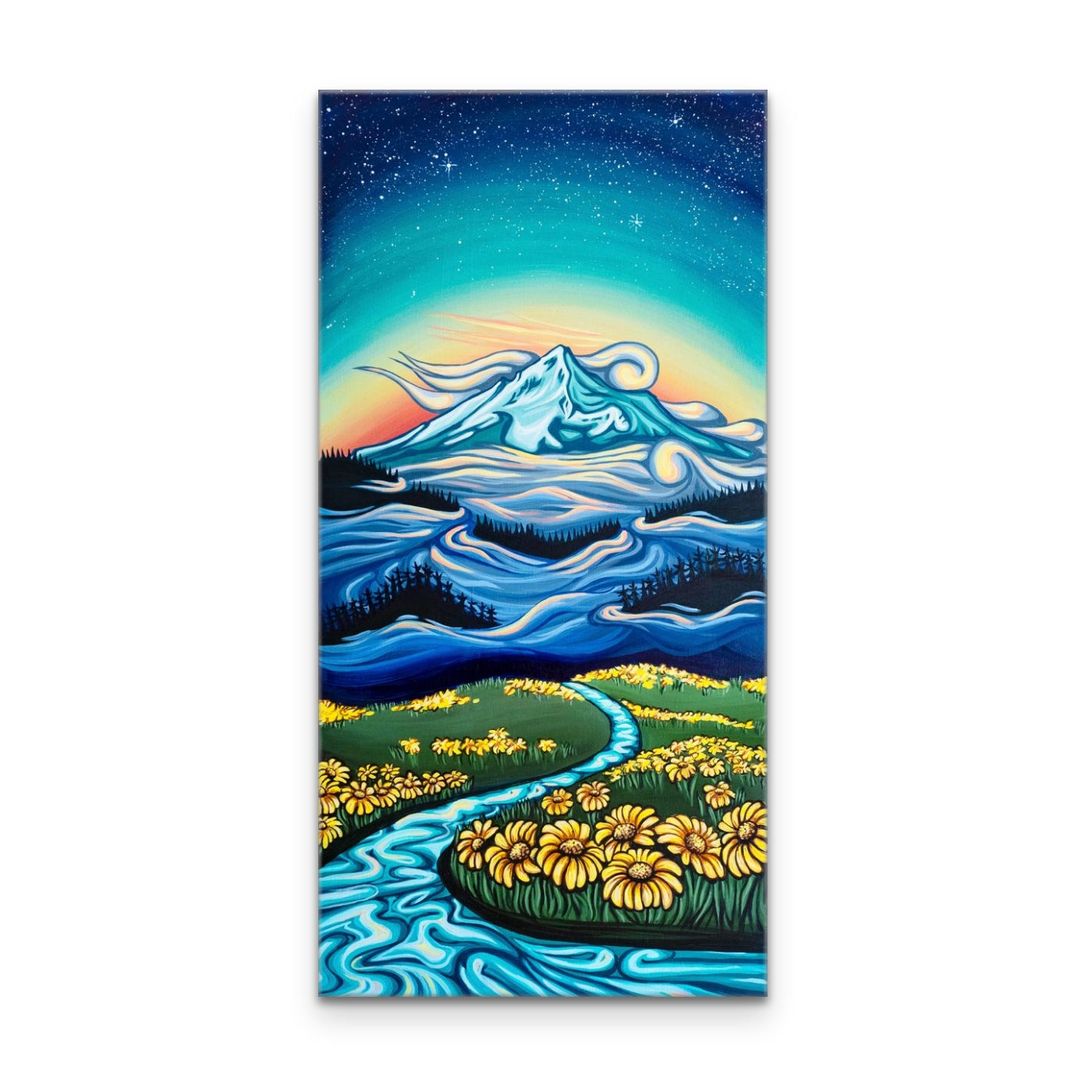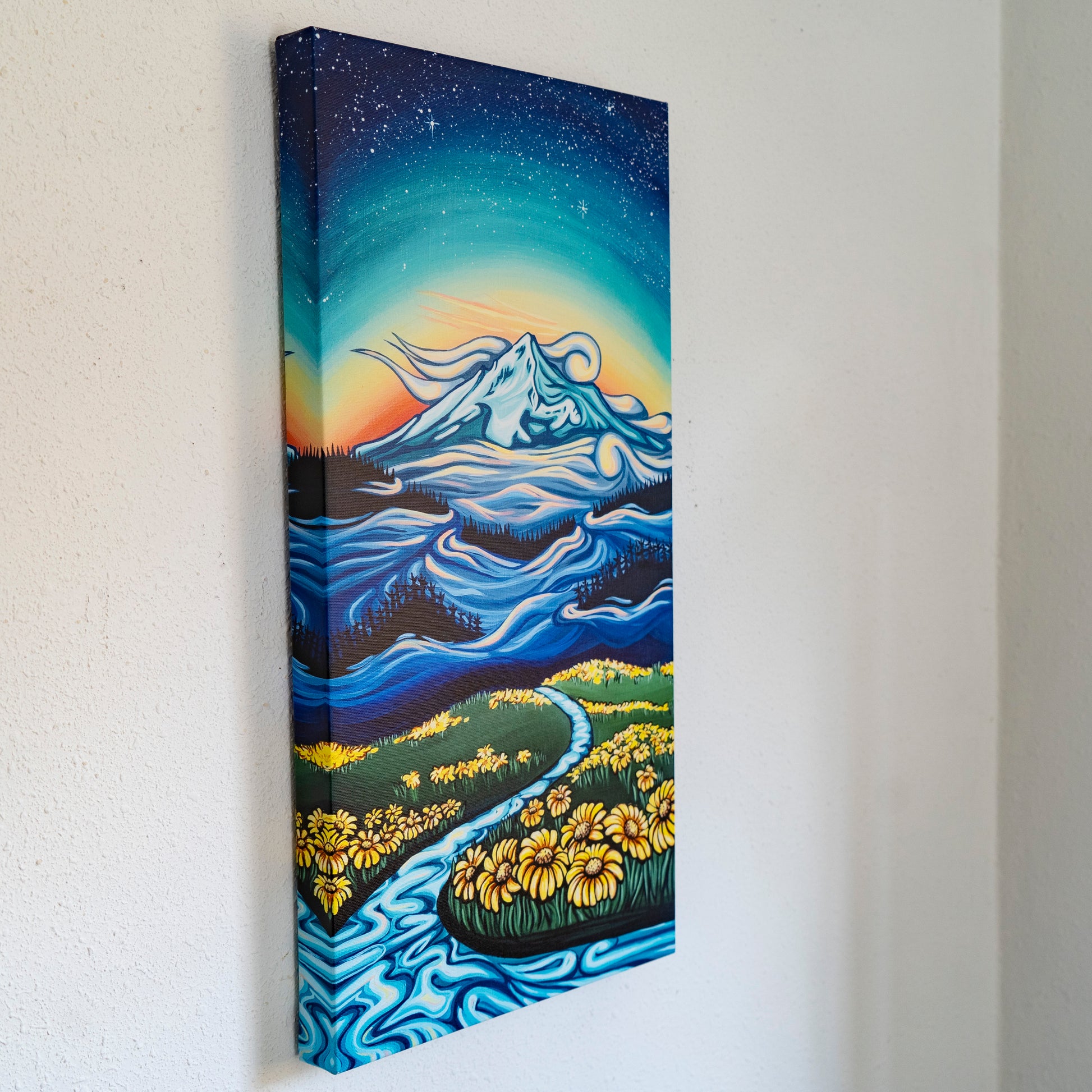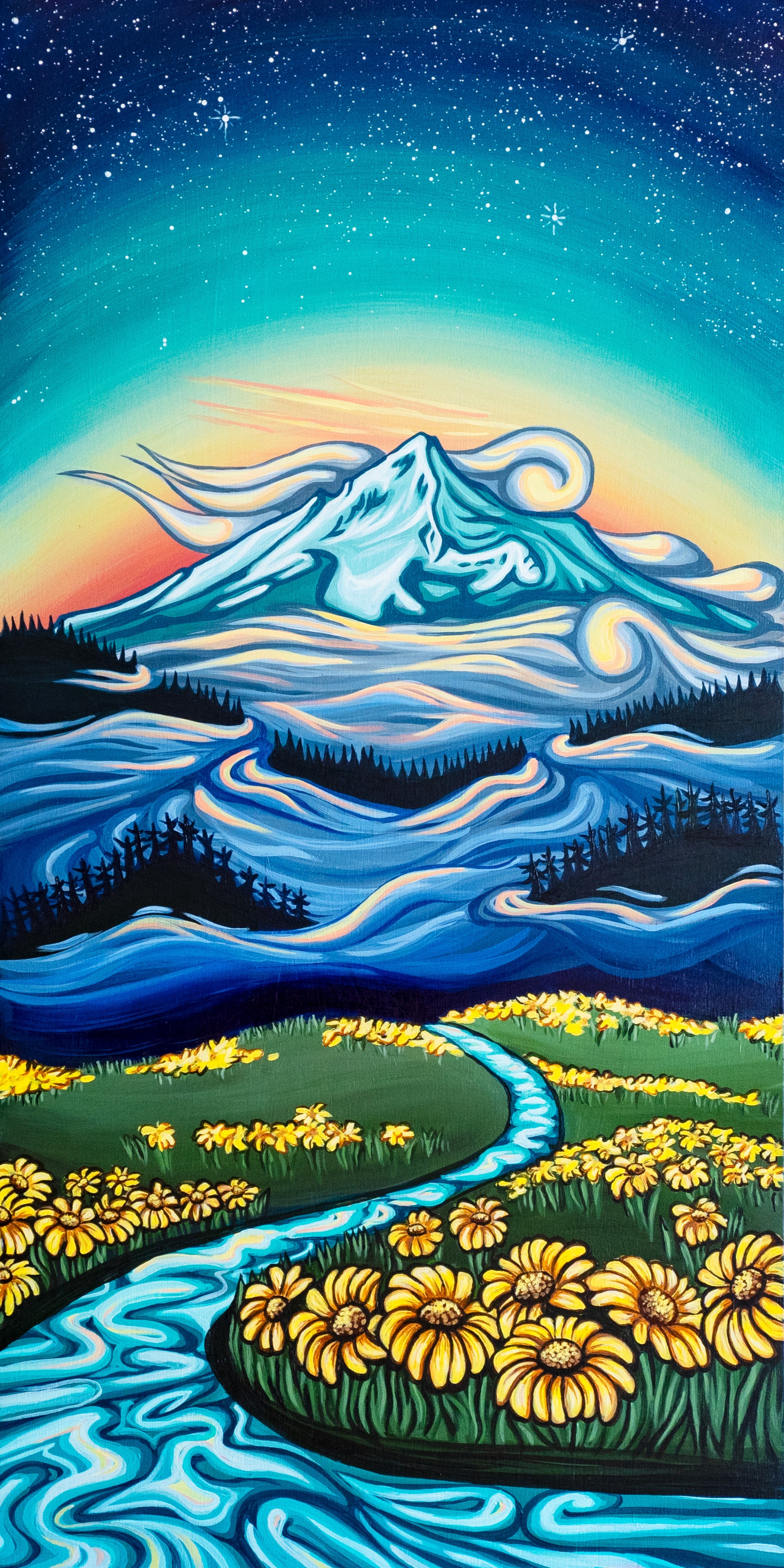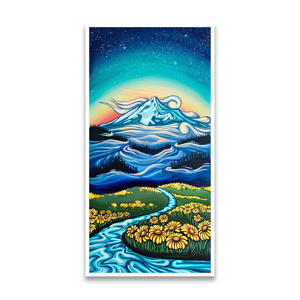 Neverland is a magical place where warm sun brushes across alpine fields of wildflowers. Where mystical mountains tower above. Where the stars shine even when it's daylight. The particular mountain is a rendition of Mount Hood.
