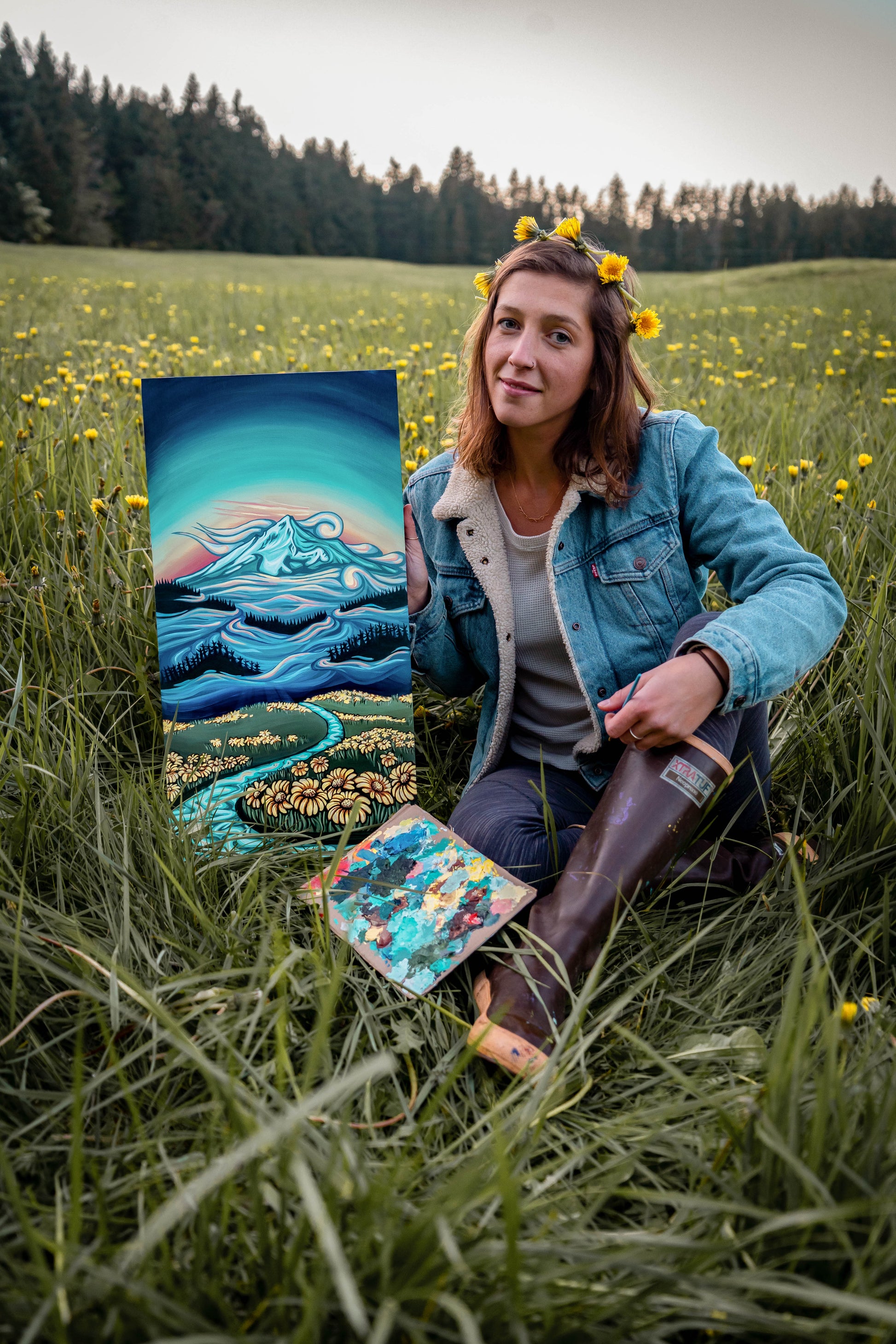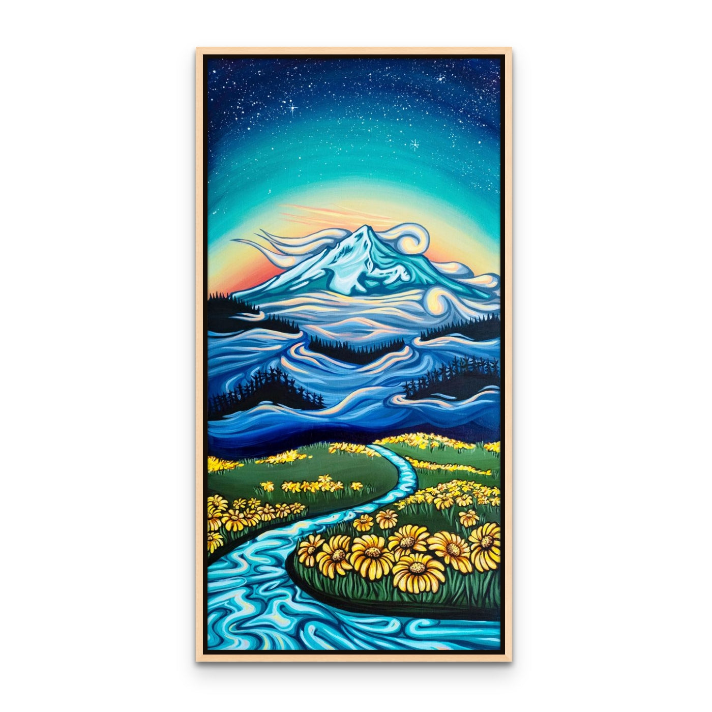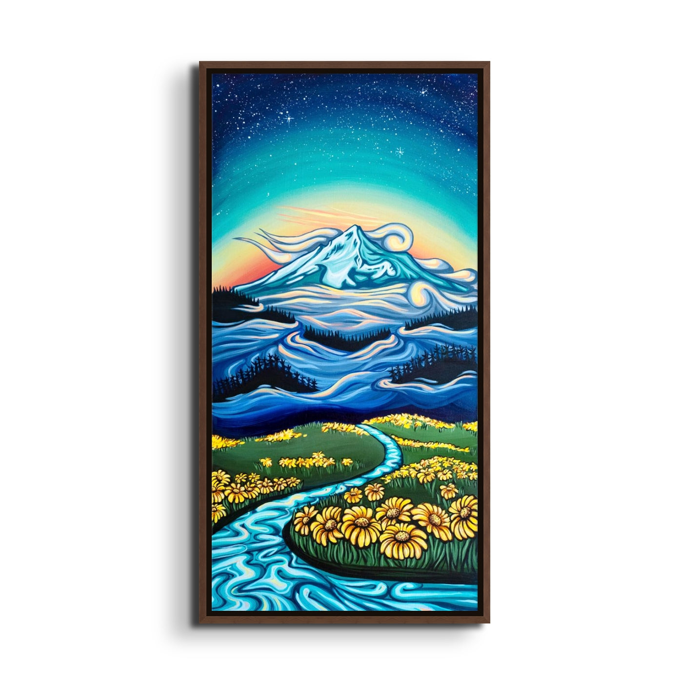 Neverland is a magical place where warm sun brushes across alpine fields of wildflowers. Where mystical mountains tower above. Where the stars shine even when it's daylight. The particular mountain is a rendition of Mount Hood.