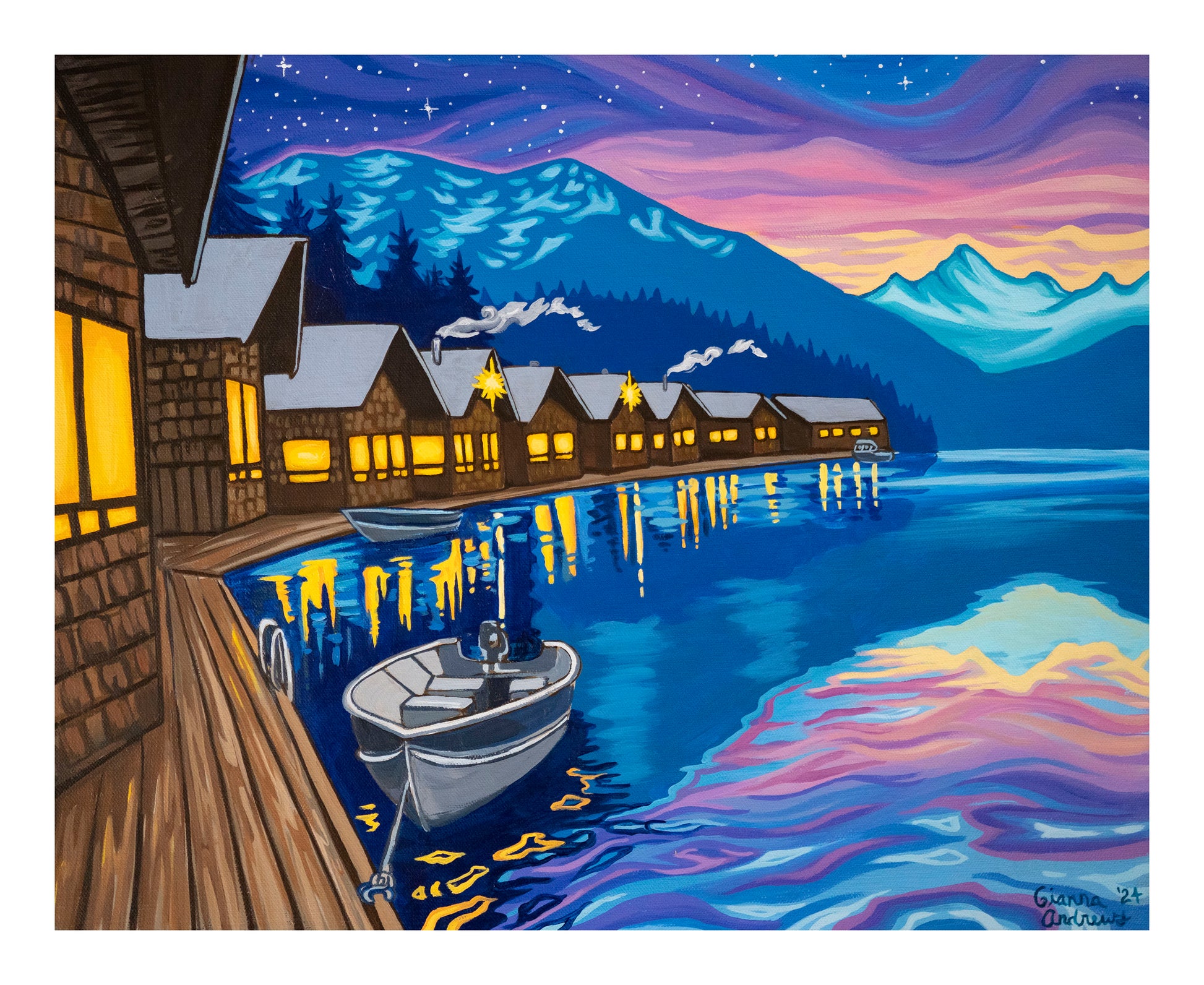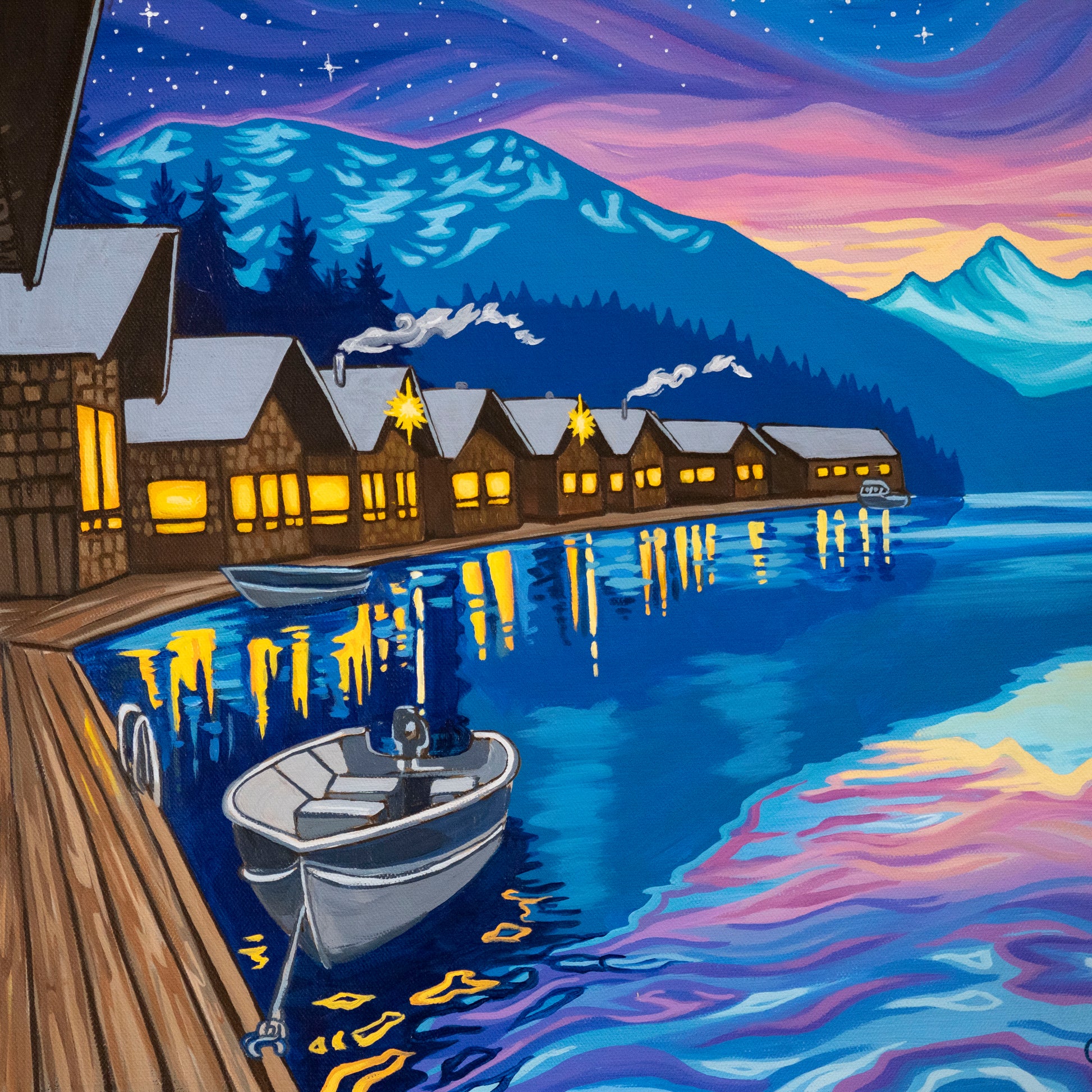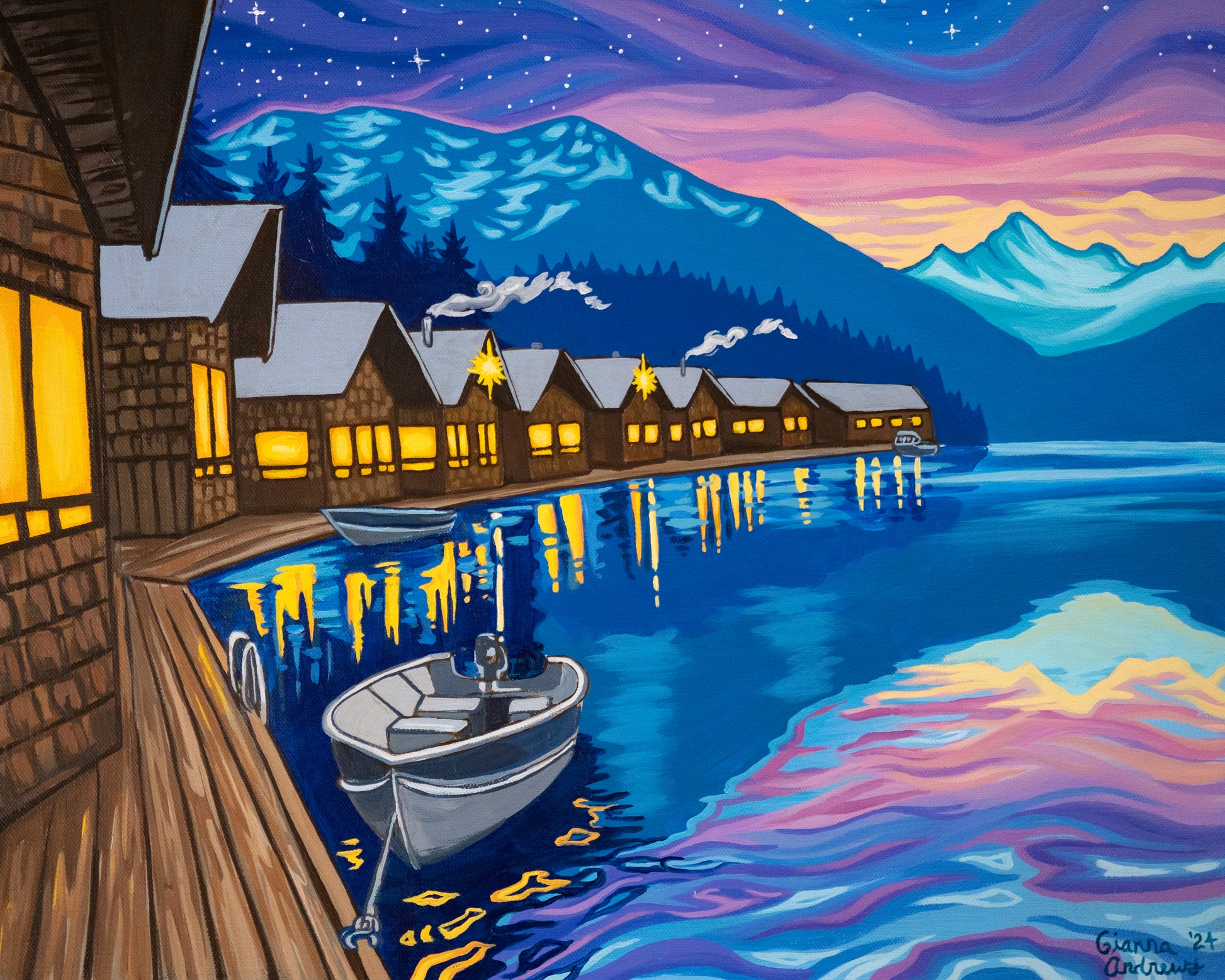 Lake waters whisper you to sleep in your own personal cozy cabin. Mountains tower above. The world is reflected all around you on this unforgettable getaway of a lifetime. Inspired by a magical stay at Ross Lake Resort in Washington State.