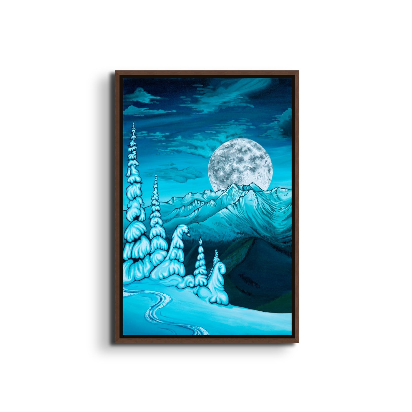 Inspired by whimsical dreams of sweeping moonlit mountains, contrasting deep valleys, and snow ghost trees. A single pair of ski tracks gently graces the foreground, providing the viewer an impression of experiencing this scene in peaceful solitude. Fill your home with snowy mountain dreams.