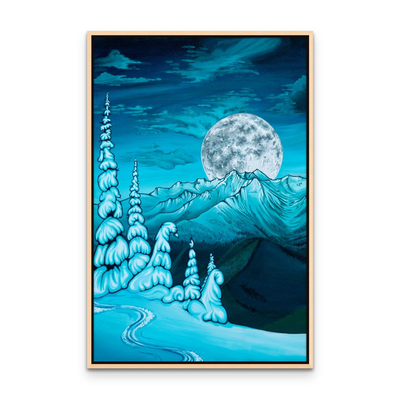 Inspired by whimsical dreams of sweeping moonlit mountains, contrasting deep valleys, and snow ghost trees. A single pair of ski tracks gently graces the foreground, providing the viewer an impression of experiencing this scene in peaceful solitude. Fill your home with snowy mountain dreams.