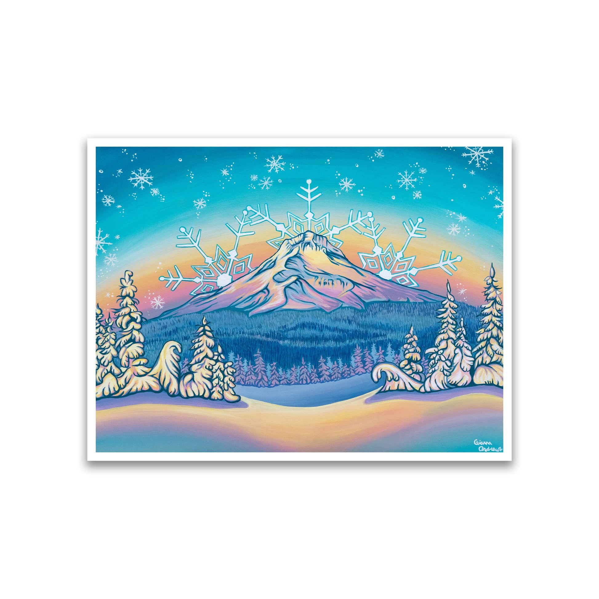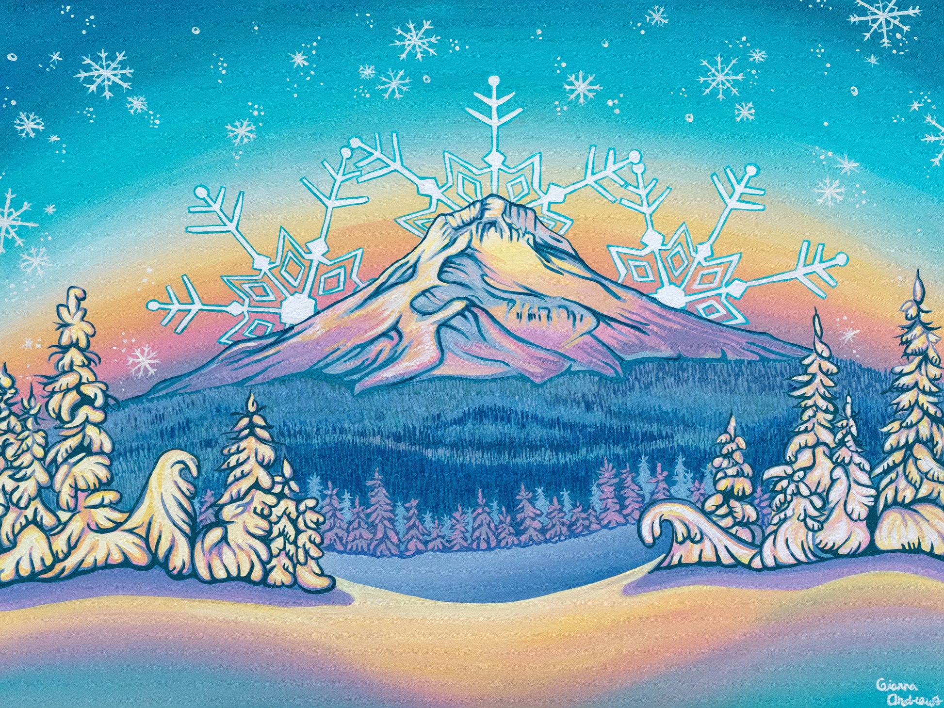 Snowflake is inspired by seeking the light of high alpine terrain during dark winter months, as snowflakes twinkle about. Mount Hood, Oregon stands as a pillar of glowing light in this piece.