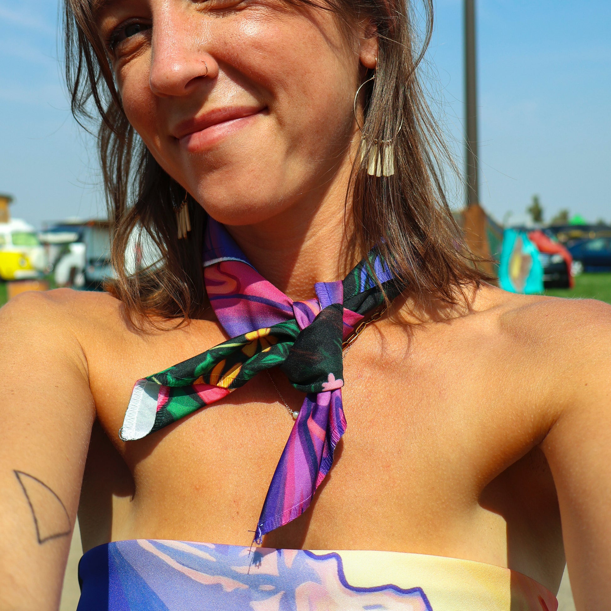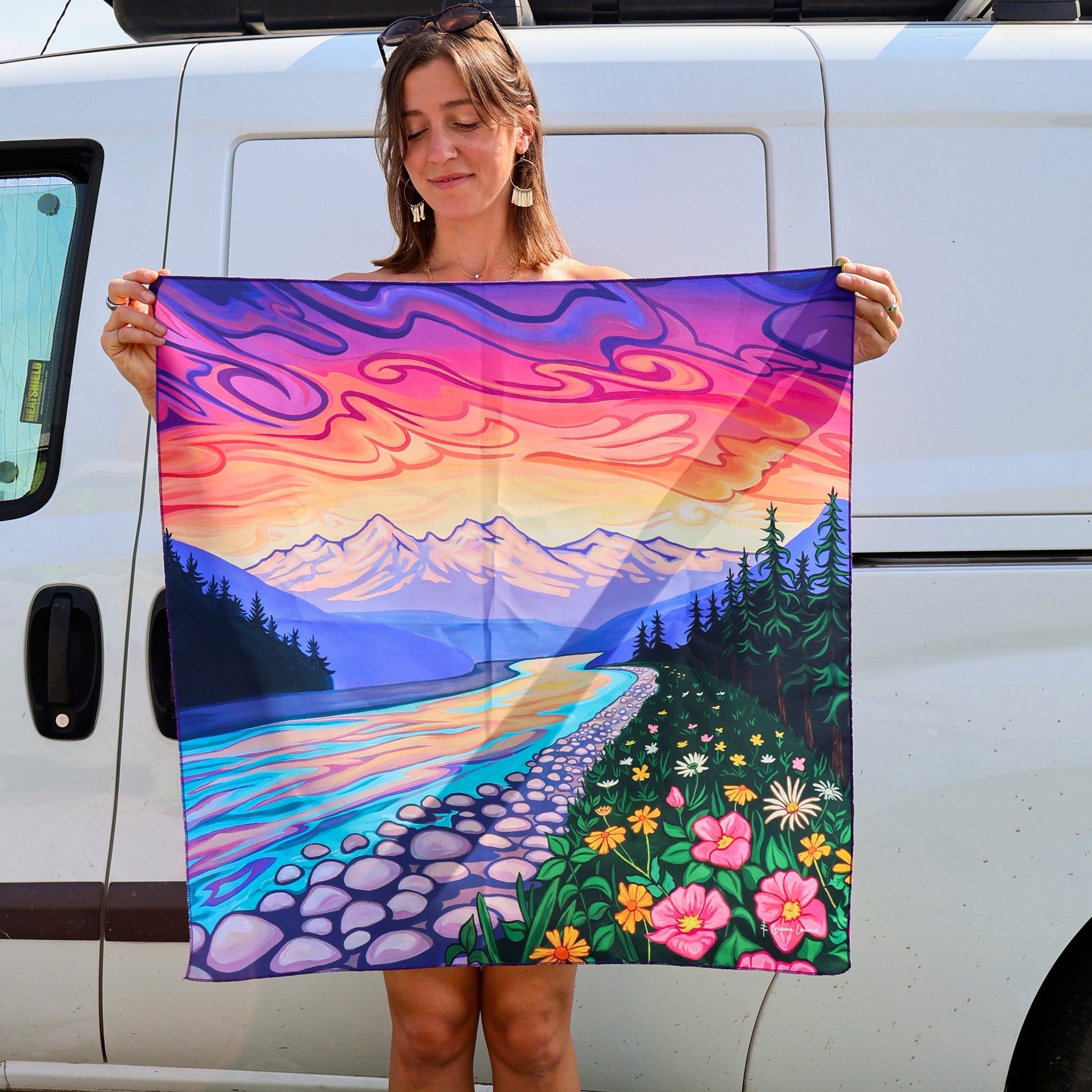 This sublimation print can be worn and displayed in many ways—style it as a head scarf, wrap, or bandana, use it as a vibrant accessory for your dog, or hang it as unique wall art.